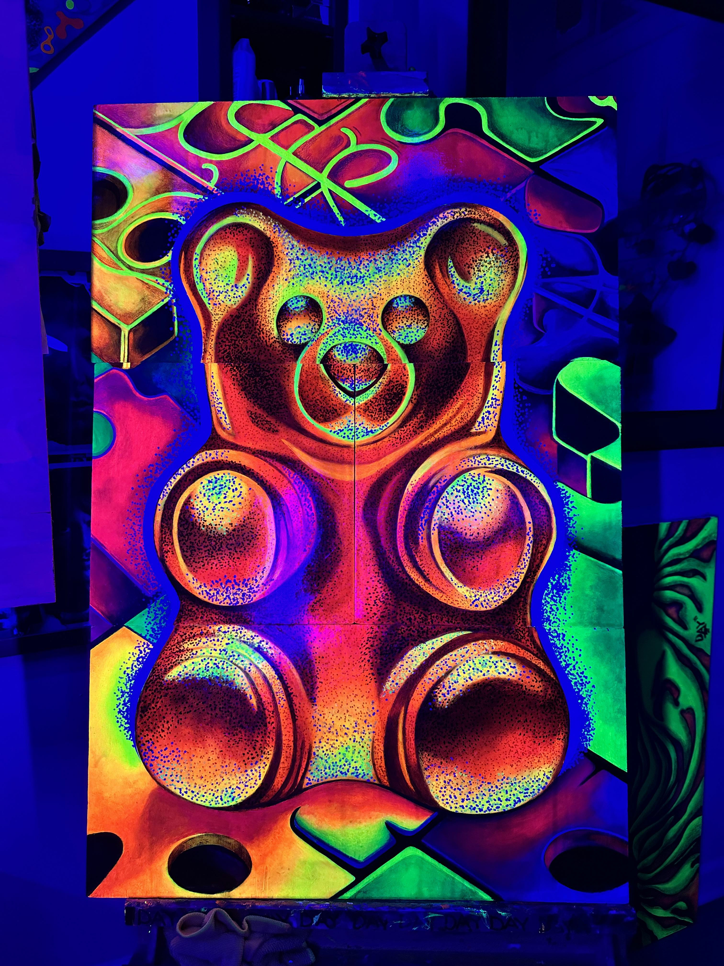 The piece is brought to life with UV-reactive acrylic paint and holographic glitter, creating an immersive experience under specific lighting. The glowing colors reflect the emotional intensity and unpredictability of BPD, while the shimmering glitter symbolizes fleeting moments of joy amidst adversity. Trapped in a Smile serves as both a personal narrative and a universal commentary on the pressures of masking inner turmoil. It invites viewers to empathize with the struggles of mental health and challenges societal expectations, fostering dialogue on emotional resilience and authenticity in the face of stigma.